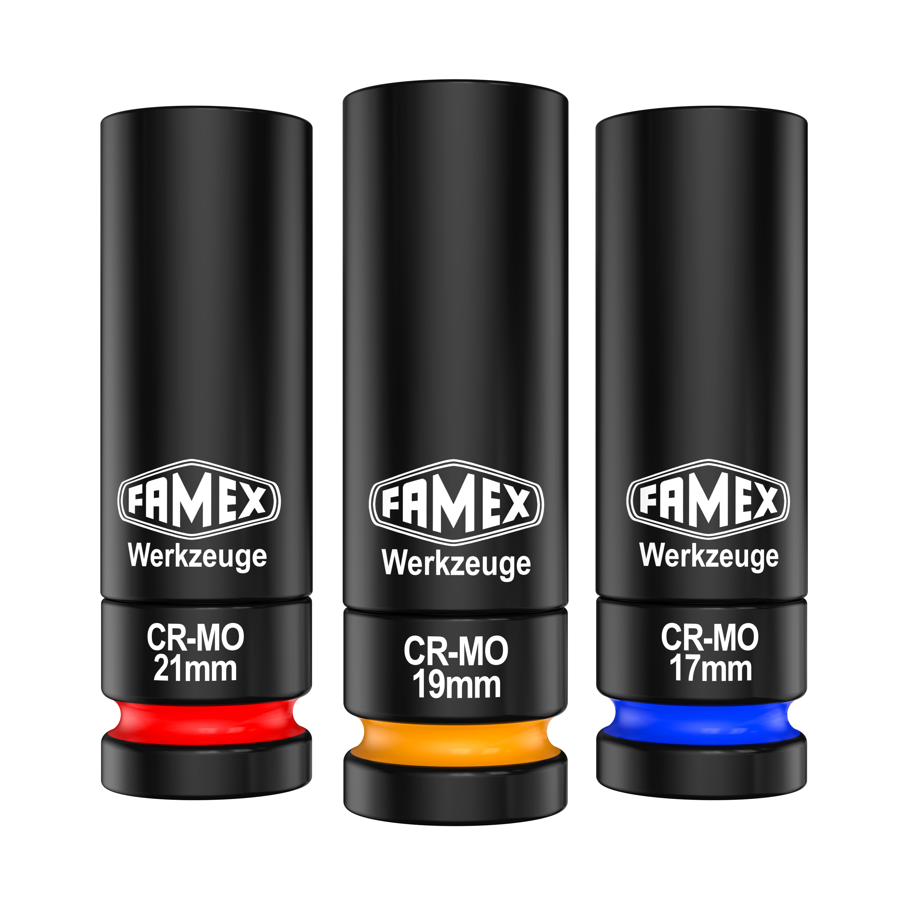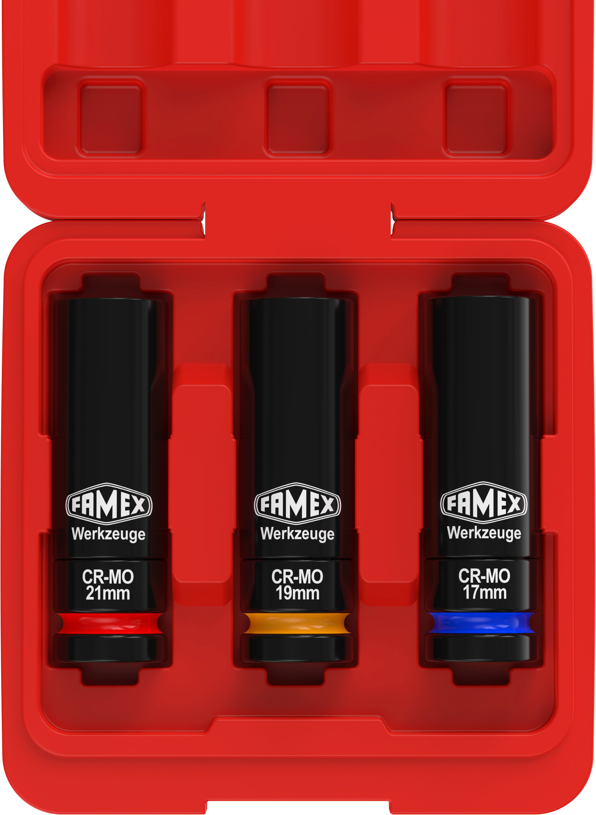Satz mit drei farbmarkierten Schonnüssen (17 mm, 19 mm, 21 mm) zur sicheren Demontage von Radschrauben mit 1/2"-Antrieb – passend für Schlagschrauber, Drehmomentschlüssel und Radmutterschlüssel.