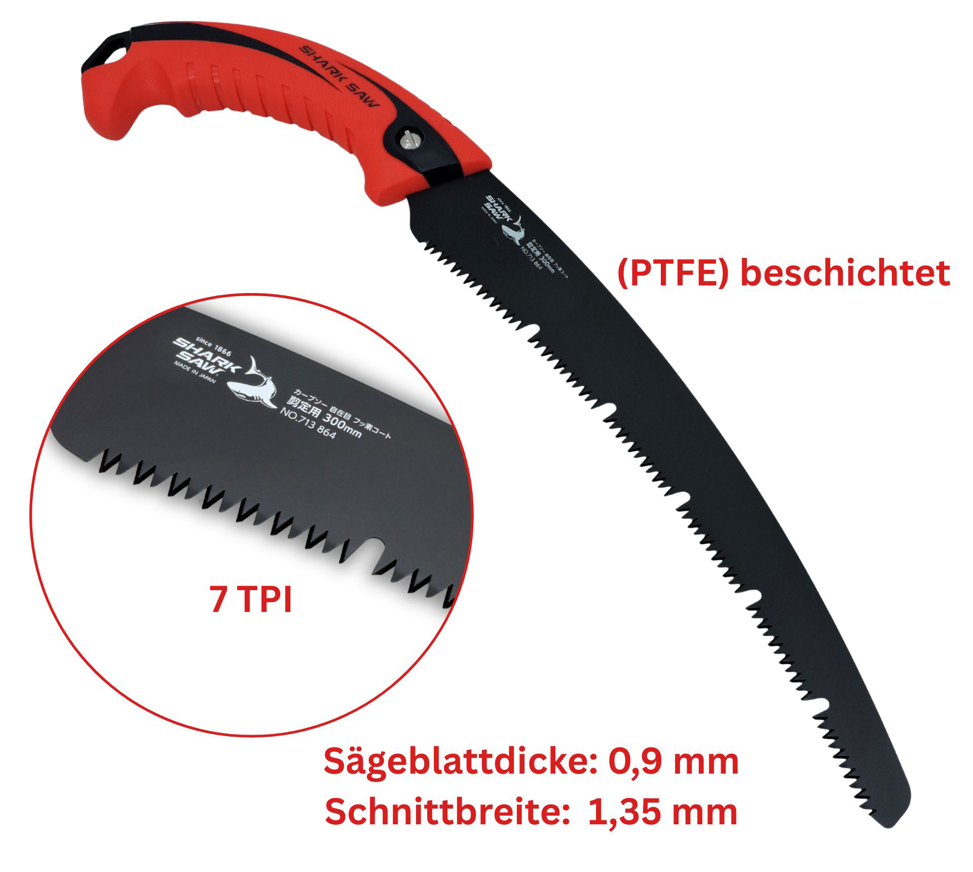Das gebogene Sägeblatt zieht sich beim Sägen automatisch tiefer ins Holz, was ein schnelleres Arbeiten – insbesondere bei dickerem Astwerk – ermöglicht. Die spezielle PTFE-Reibungsbeschichtung sorgt dafür, dass das Blatt feuchtigkeits- und harzbeständig ist. Die induktionsgehärteten Zähne garantieren eine besonders lange Standzeit und hohe Schnittleistung auch bei intensiver Nutzung.